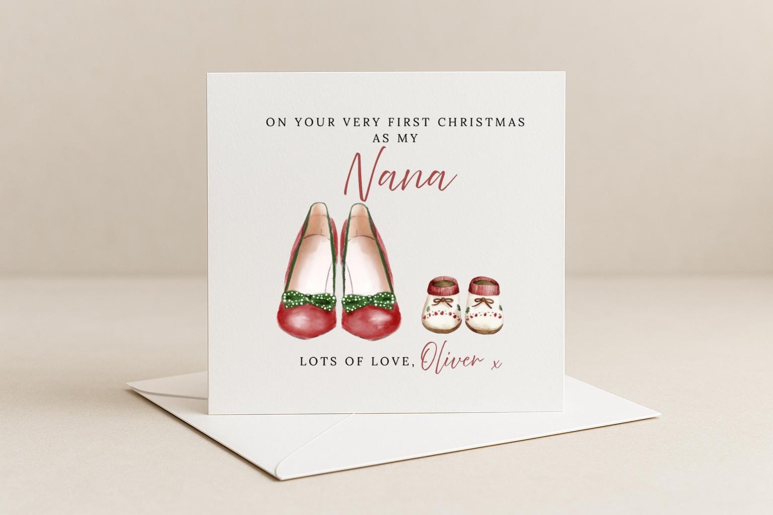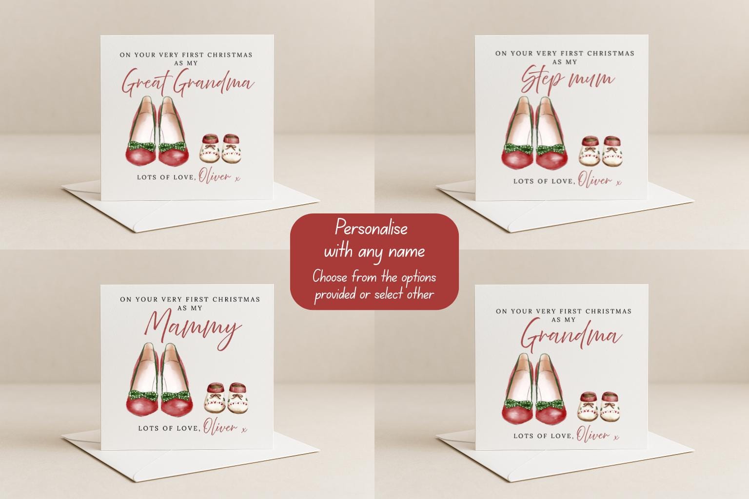 This card is perfect for a first Christmas as Mummy, Grandma, Auntie, Great Grandmother – or you can even choose your own name or title to make it completely personal.